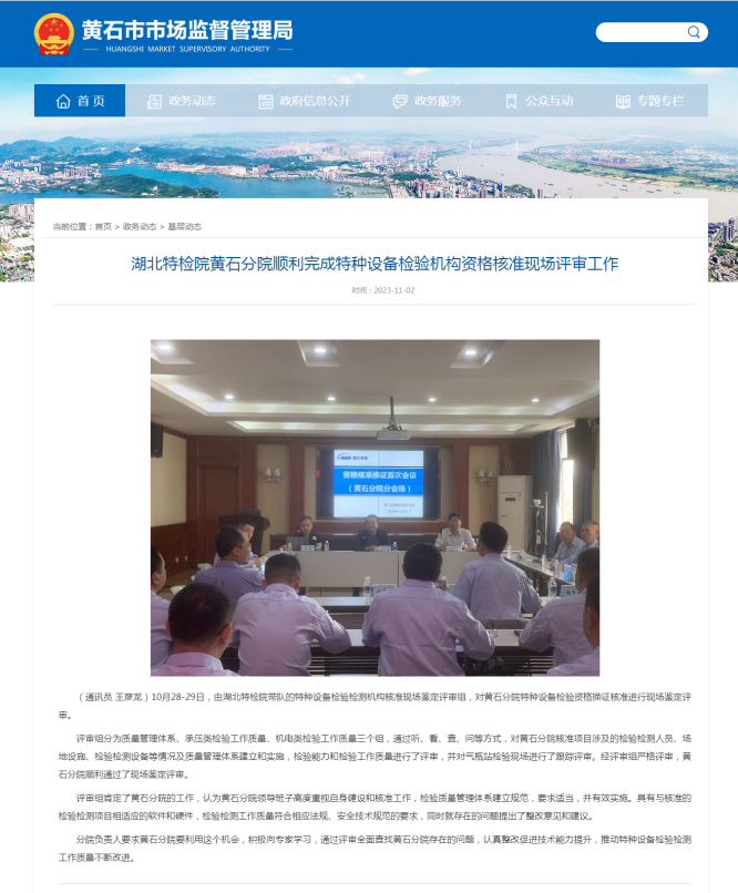 黃石市市(shì)場監督管(guǎn)理局網站(zhan)(2025.12.女排🔞最新消息🌈30)厦门成同机电制造有限公司(5G网站)黃石分院(yuàn)順利完成(cheng)😄特種設備(bèi)檢驗機構(gou)資格核準(zhun)現場評審(shěn)工作