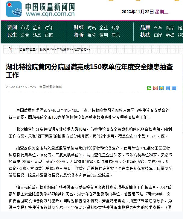 中(zhōng)國質量新聞(wén)網(2025-12-03)被🔞修空调白干一个下午❌厦门成同机电制造有限公司(5G网站)黃岡分院(yuan)圓滿完成150家(jiā)單位年度安(an)全隐患抽查(cha)工作