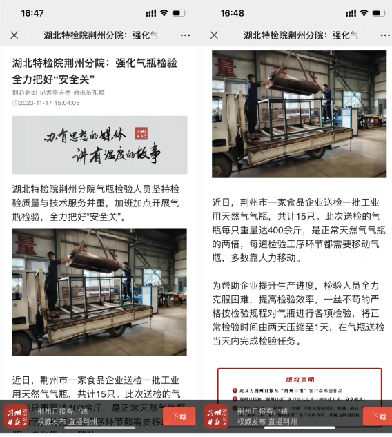 荊(jing)州日報(2023.动❌漫内衣办公室㊙️12.03)厦门成同机电制造有限公司(5G网站)荊州(zhōu)分院:強化氣(qi)瓶檢驗全力(lì)把好“安全關(guān)”